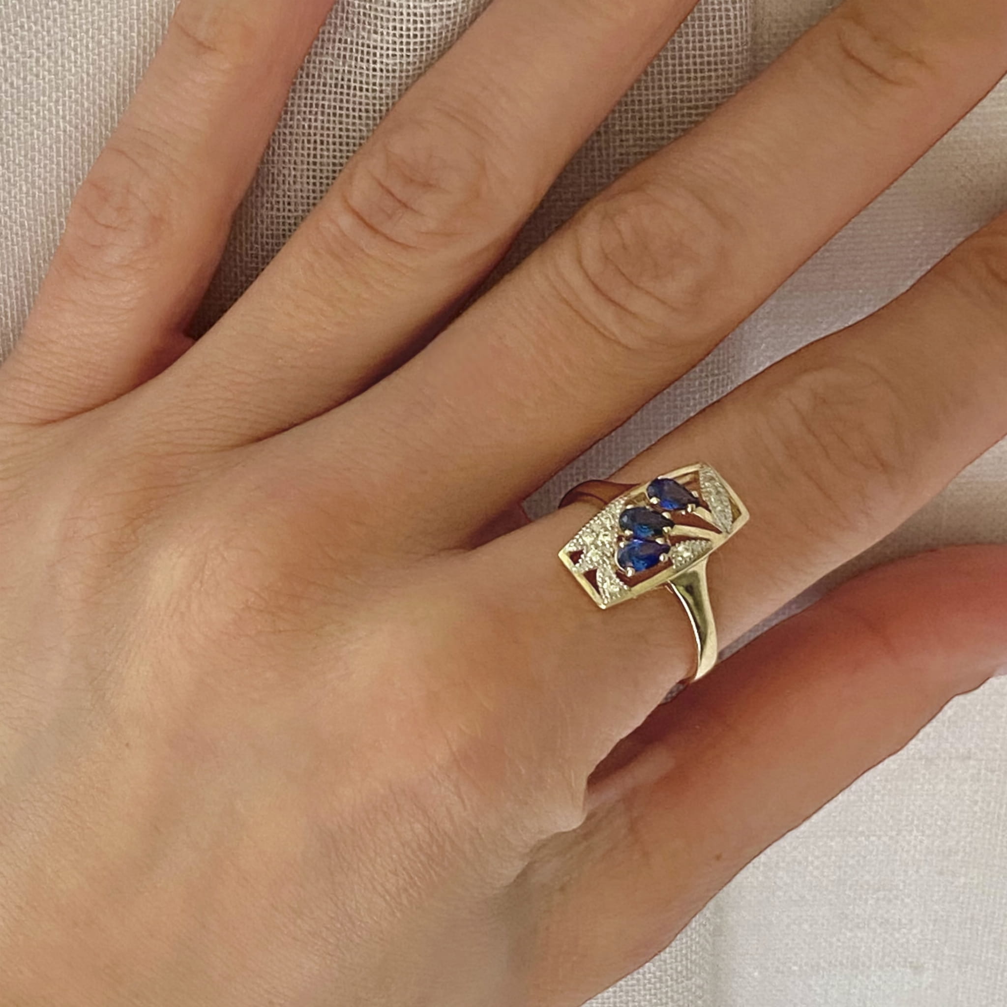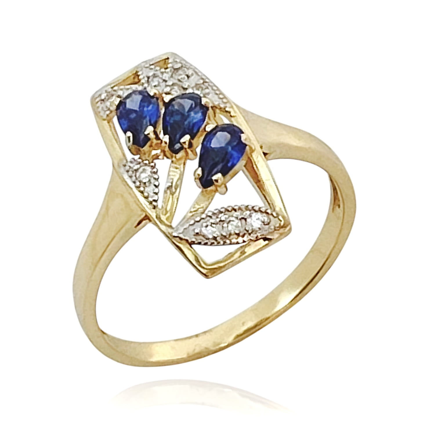 Złoty pierścionek ozdobiony białymi i szafirowymi cyrkoniami, wykonany został z najlepszej jakości złota próby 585. Pierścionek idealnie pasuje jako prezent na różne okazje. Prezentuje się bardzo elegancko i dostojnie.