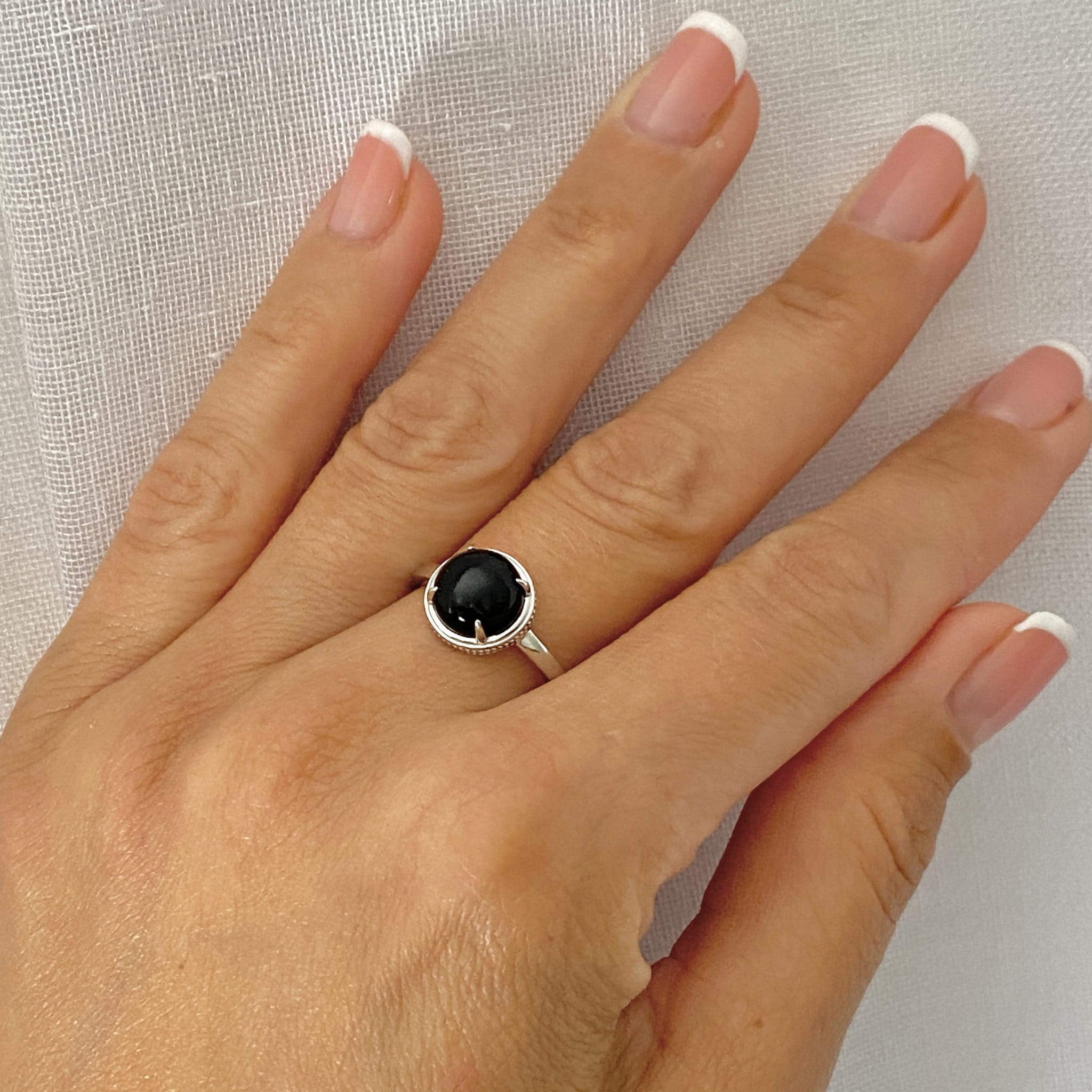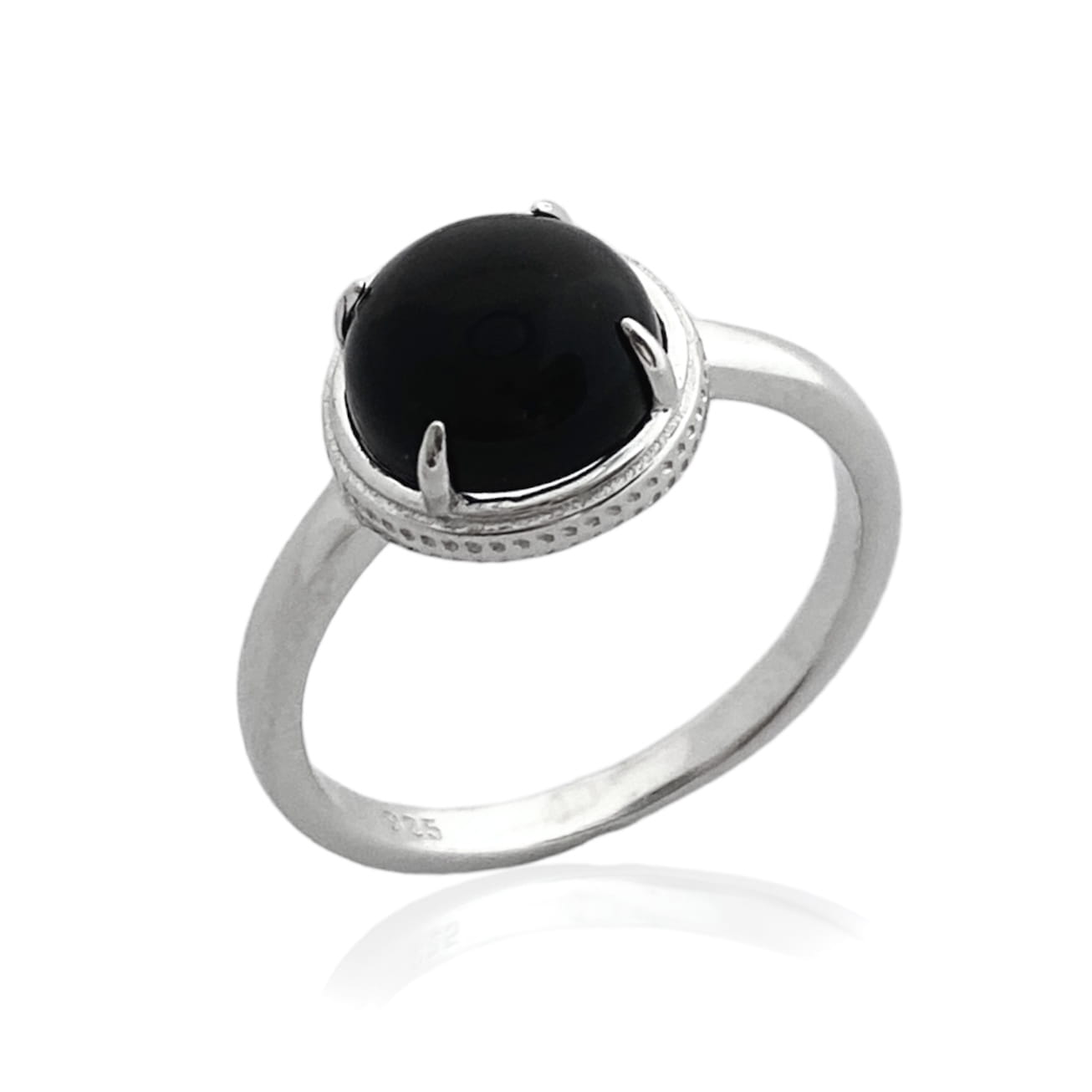 Wyjątkowy pierścionek ozdobiony czarnym kamieniem został wykonany z najlepszej jakości srebra próby 925. Dodatkowo pierścionek jest rodowany, co sprawia, że pięknie się błyszczy. Prezentuje się bardzo elegancko, dodając uroku każdej stylizacji. Pierścionek sprawdzi się idealnie jako pomysł na prezent.