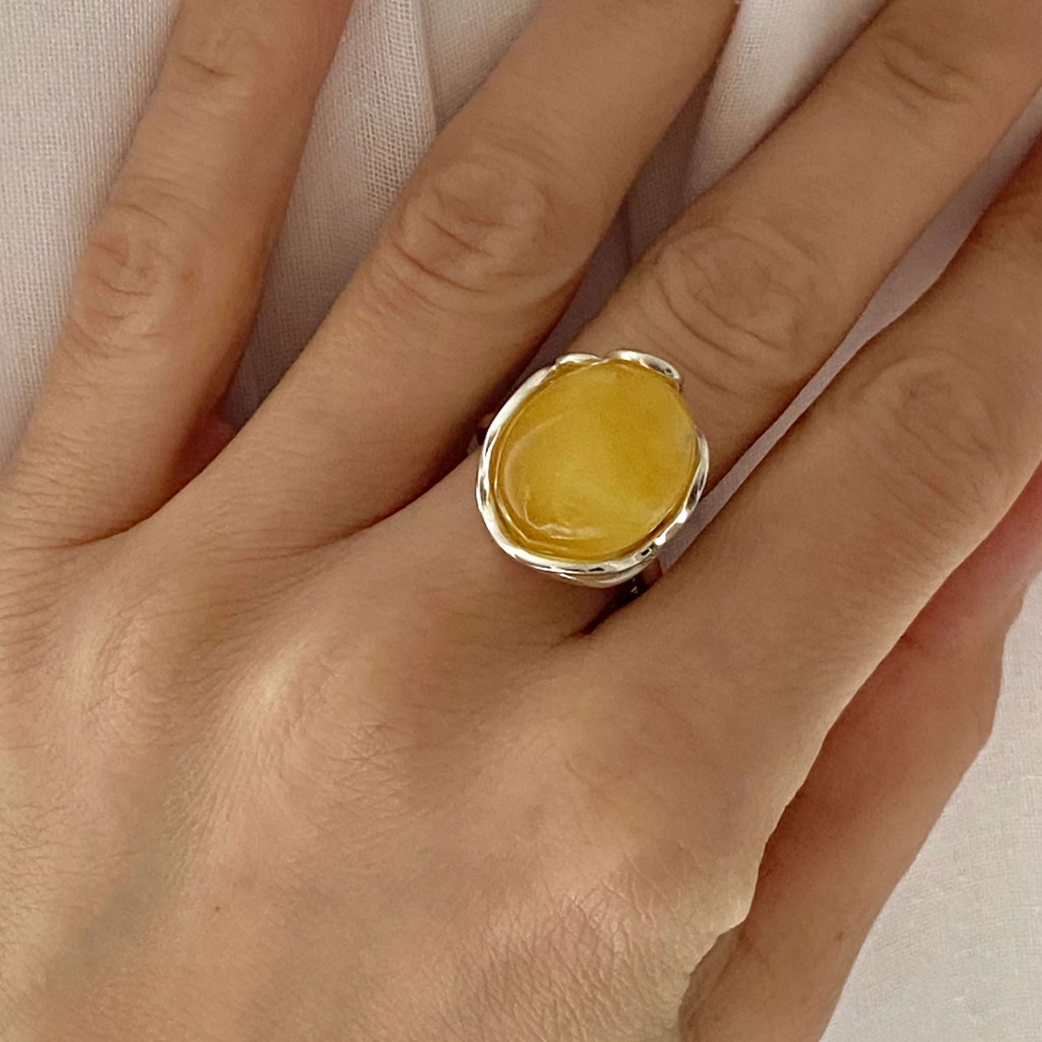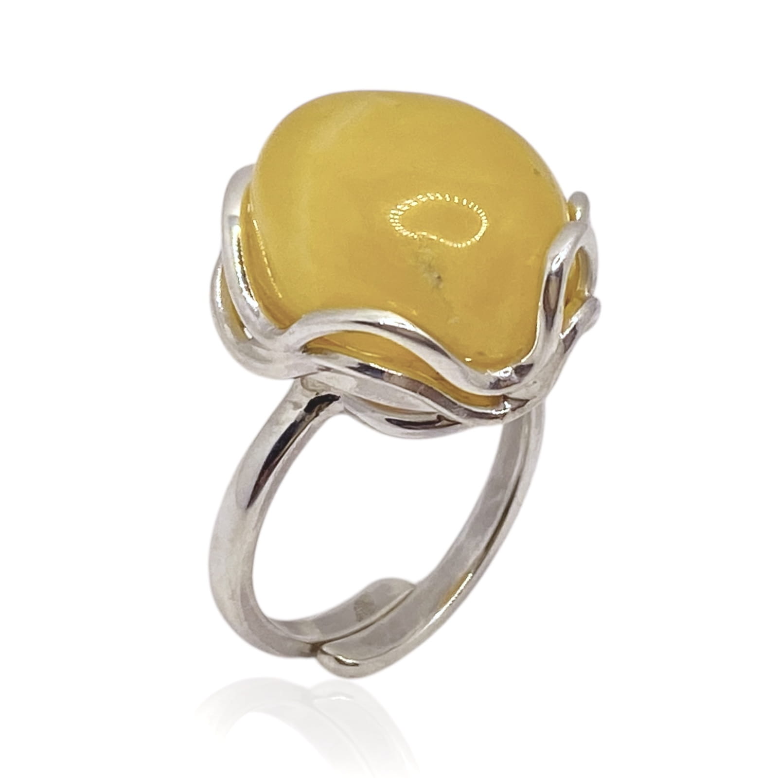 Elegancki pierścionek ozdobiony bursztynem naturalnym w kolorze mleczno-żółtym, został wykonany z najlepszej jakości srebra próby 925. Pierścionek ma regulowany rozmiar, więc możemy dostosować odpowiedni dla siebie. Rozmiar możemy regulować o +/- 4 rozmiary. Pierścionek sprawdzi się idealnie jako pomysł na prezent. Do kompletu można dokupić naszyjnik lub bransoletkę.