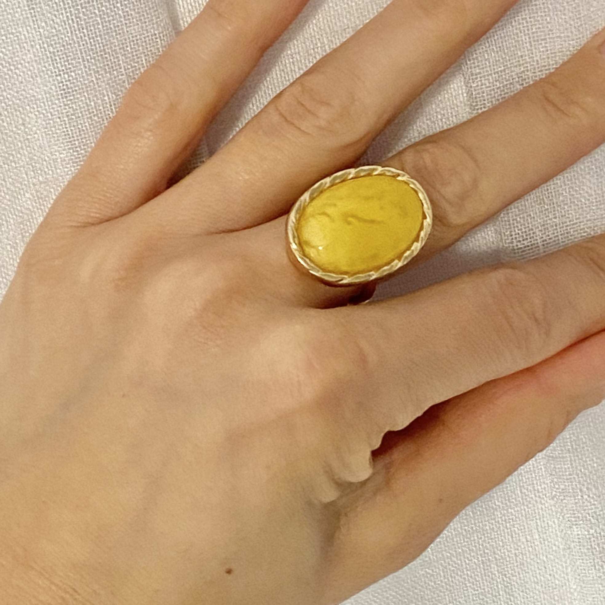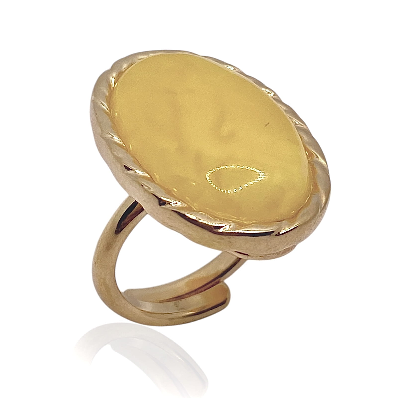Elegancki pierścionek ozdobiony bursztynem naturalnym w kolorze żółtym, został wykonany z najlepszej jakości srebra próby 925. Dodatkowo pierścionek pozłacany jest 14k złotem. Pierścionek ma regulowany rozmiar, więc można dostosować odpowiedni dla siebie. Rozmiar możemy regulować o +/- 4 rozmiary. Pierścionek sprawdzi się idealnie jako pomysł na prezent. Do kompletu można nabyć zawieszkę.