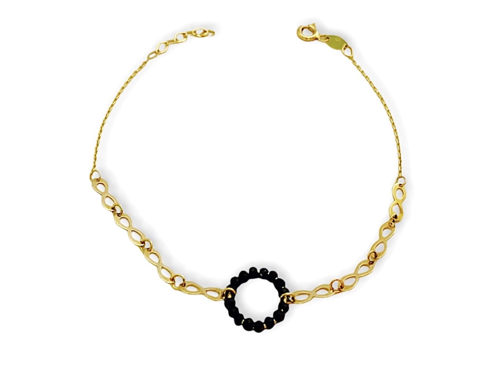 Złota bransoletka ozdobio0na znakami nieskończoności i czarnymi kamieniami, wykonana jest z najlepszej jakości złota próby 585. Bransoletka ma regulowaną długość, splot ankier pełny. Bransoletka pasuje do codziennych stylizacji każdej kobiety.