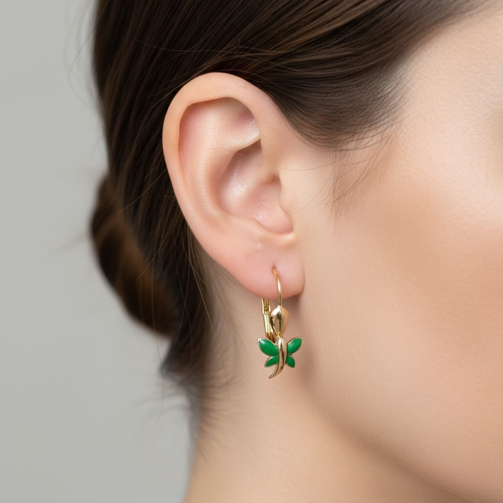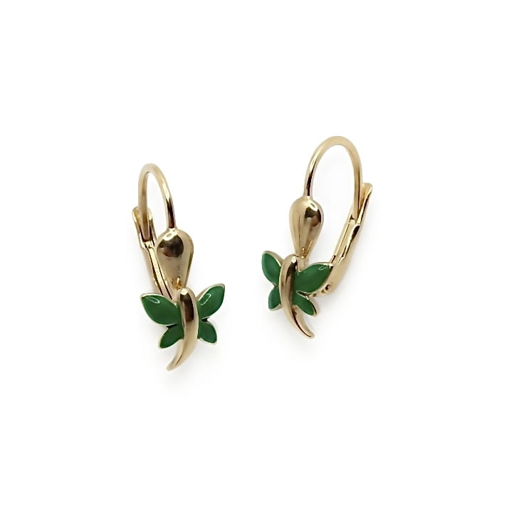 Zachwycające złote kolczyki ważki z zieloną emalią to doskonały wybór dla każdej dziewczynki lub kobiety, która lubi subtelną, a zarazem oryginalną biżuterię. Wykonane z żółtego złota próby 585, łączą w sobie elegancję i lekkość, a kolorowa emalia dodaje im wyjątkowego charakteru.