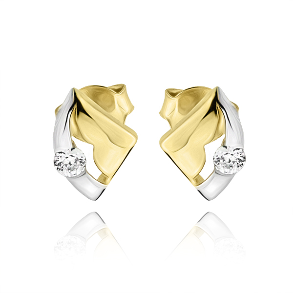 Złote kolczyki ozdobione białymi cyrkoniami, częściowo rodowane, wykonane zostały z najlepszej jakości złota próby 585. Kolczyki zapiane są na sztyft. Pasują do codziennych stylizacji kobiety.