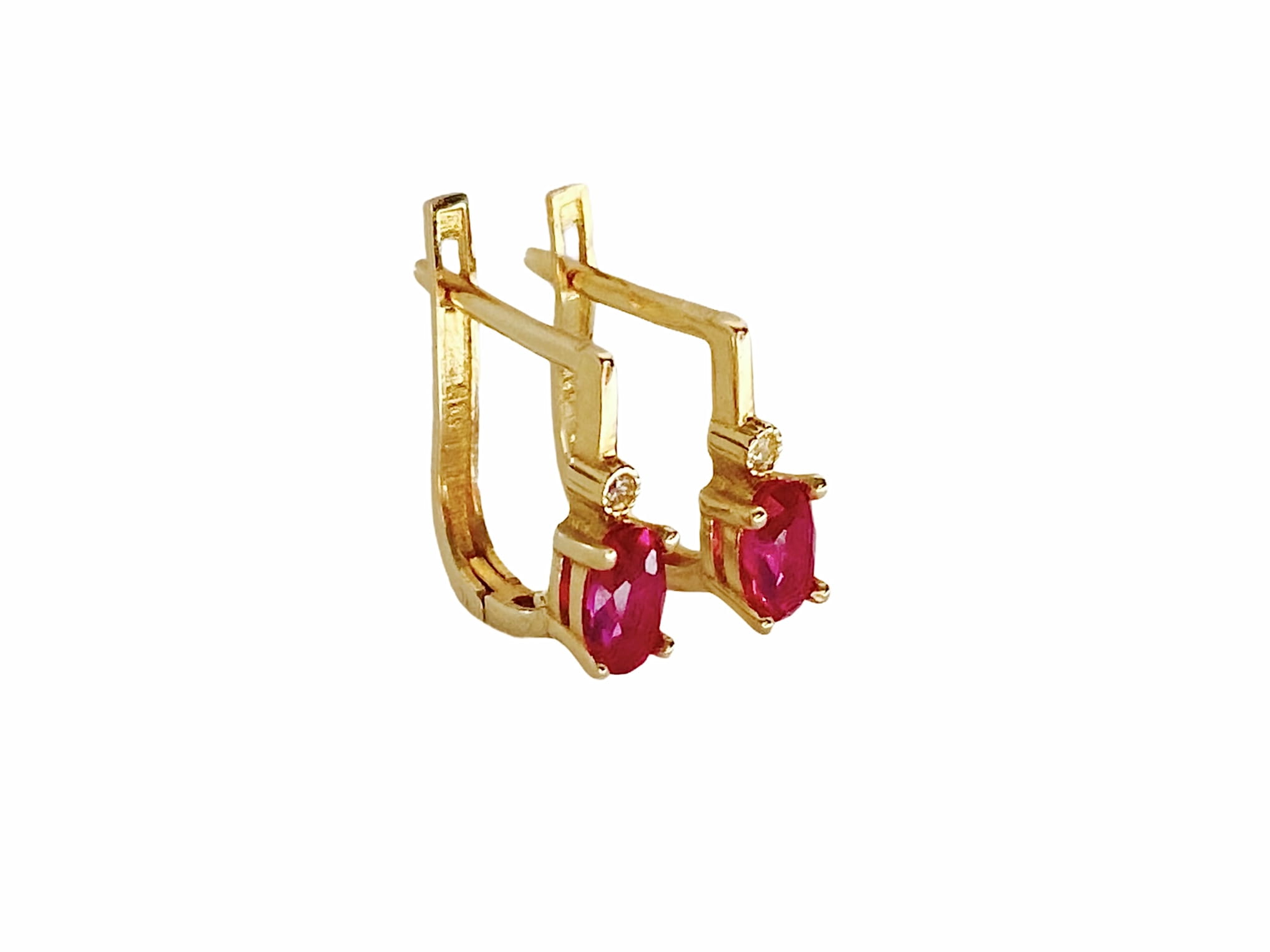 Złote kolczyki ozdobione białymi i czerwonymi cyrkoniami, zapięcie angielskie, wykonane są z najlepszej jakości złota próby 585. Kolczyki są idealne dla każdej dziewczynki.