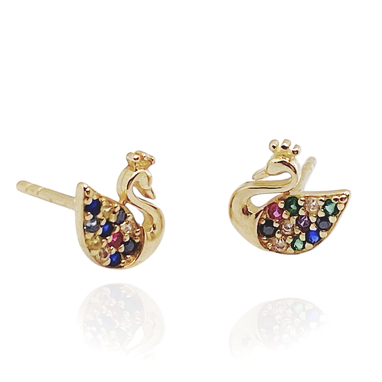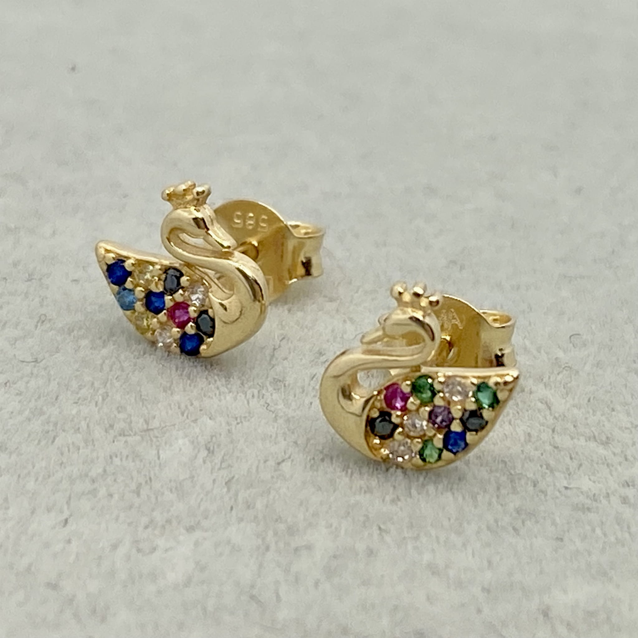 Złote kolczyki ozdobione kolorowymi cyrkoniami, wykonane zostały z najlepszej jakości złota próby 585. Kolczyki są zapinane na sztyft. Idealne do noszenia na co dzień.