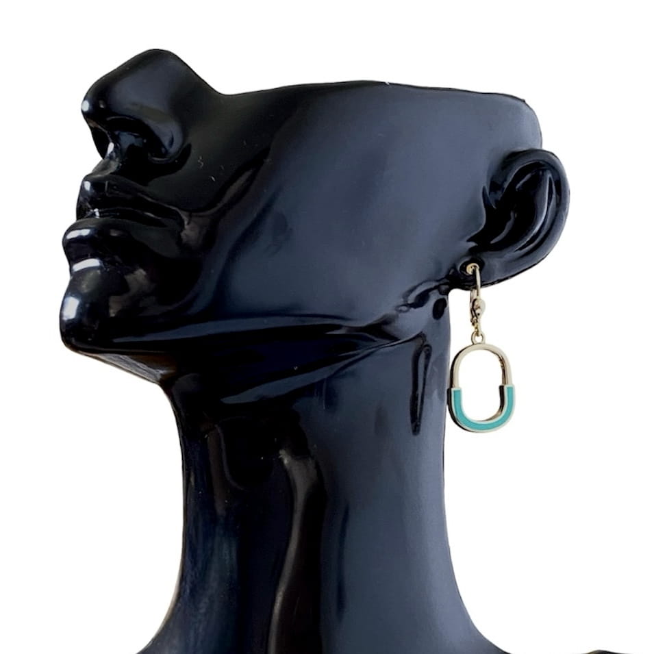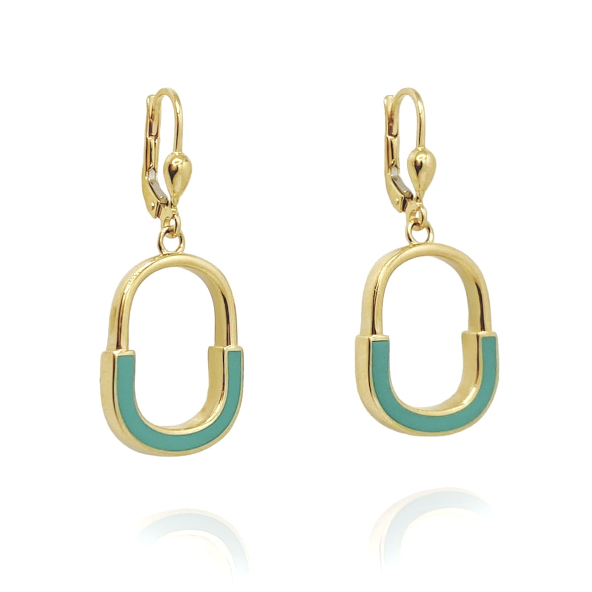 Złote, wiszące kolczyki, ozdobione seledynową emalią, wykonane zostały z najlepszej jakości złota próby 585. Kolczyki zostały ozdobione emalią, które dodają im elegancji i wyjątkowego uroku. Kolczyki zapinane są na bigiel angielski, który jest łatwy do założenia i zapewnia bezpieczne utrzymanie kolczyków na miejscu. Będą pasowały do codziennych stylizacji każdej kobiety. Do kompletu można nabyć zawieszkę.