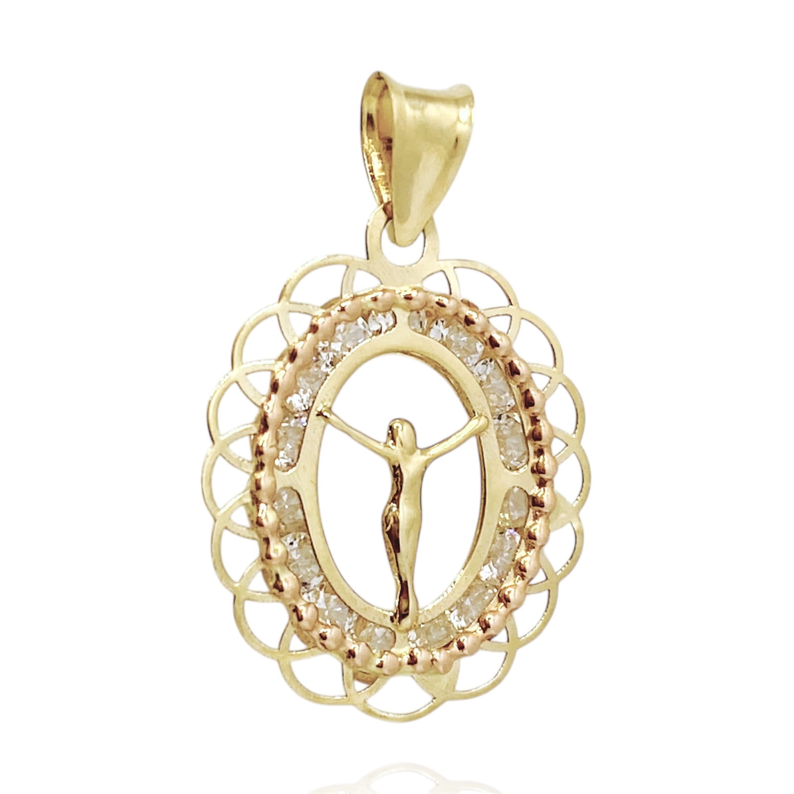 Złoty, ażurowy medalik z Jezusem Chrystusem został wykonany z najlepszej jakości złota próby 585. Medalik jest ozdobiony białymi cyrkoniami, które dodają większego blasku i elegancji. Idealnie sprawdzi się jako prezent na każdą okazję, w tym na Chrzest lub Komunię.