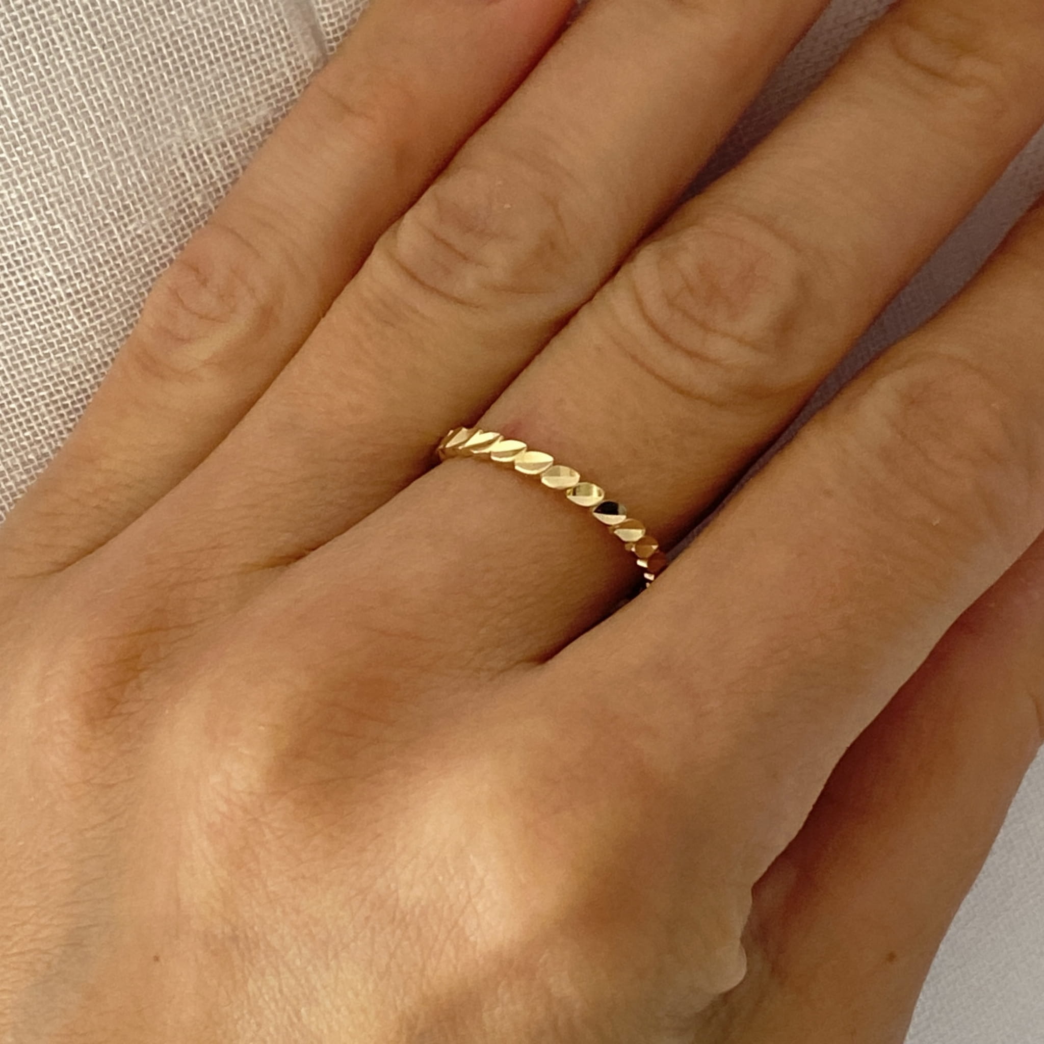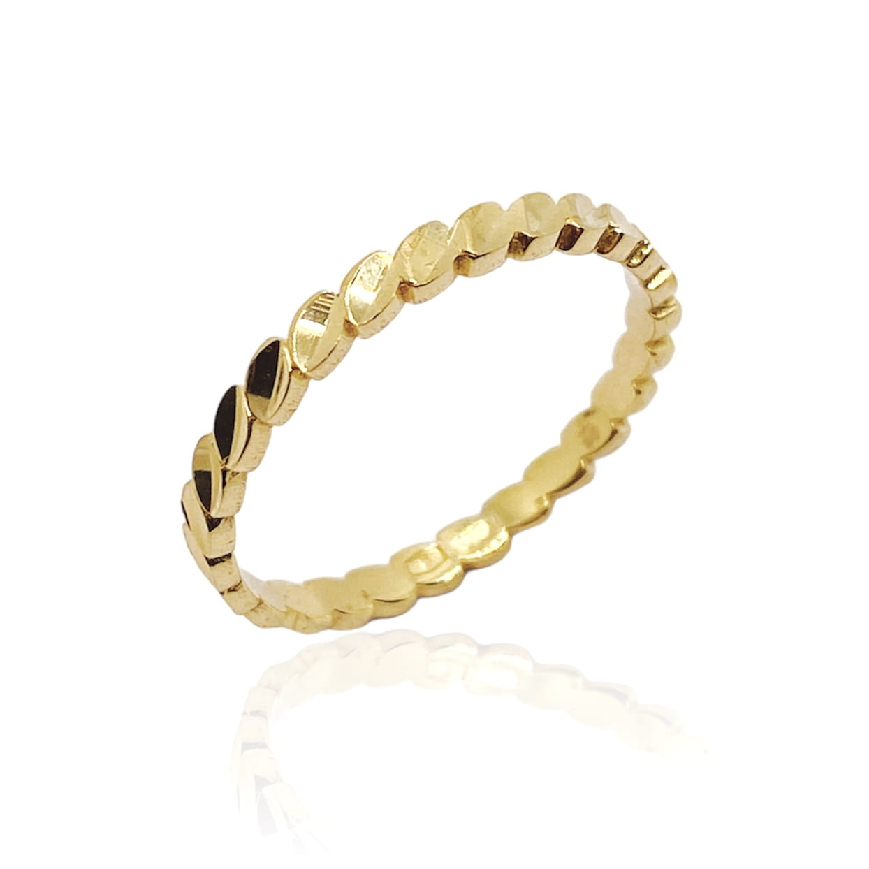 Piękny, subtelny pierścionek wykonany został z najlepszej jakości złota próby 585, który zachwyca trwałością i wysoką jakością. Pierścionek oczarowuję swoją lekkością i oryginalnym wzorem, przyciągając jednocześnie uwagę każdego, kto na niego spojrzy.