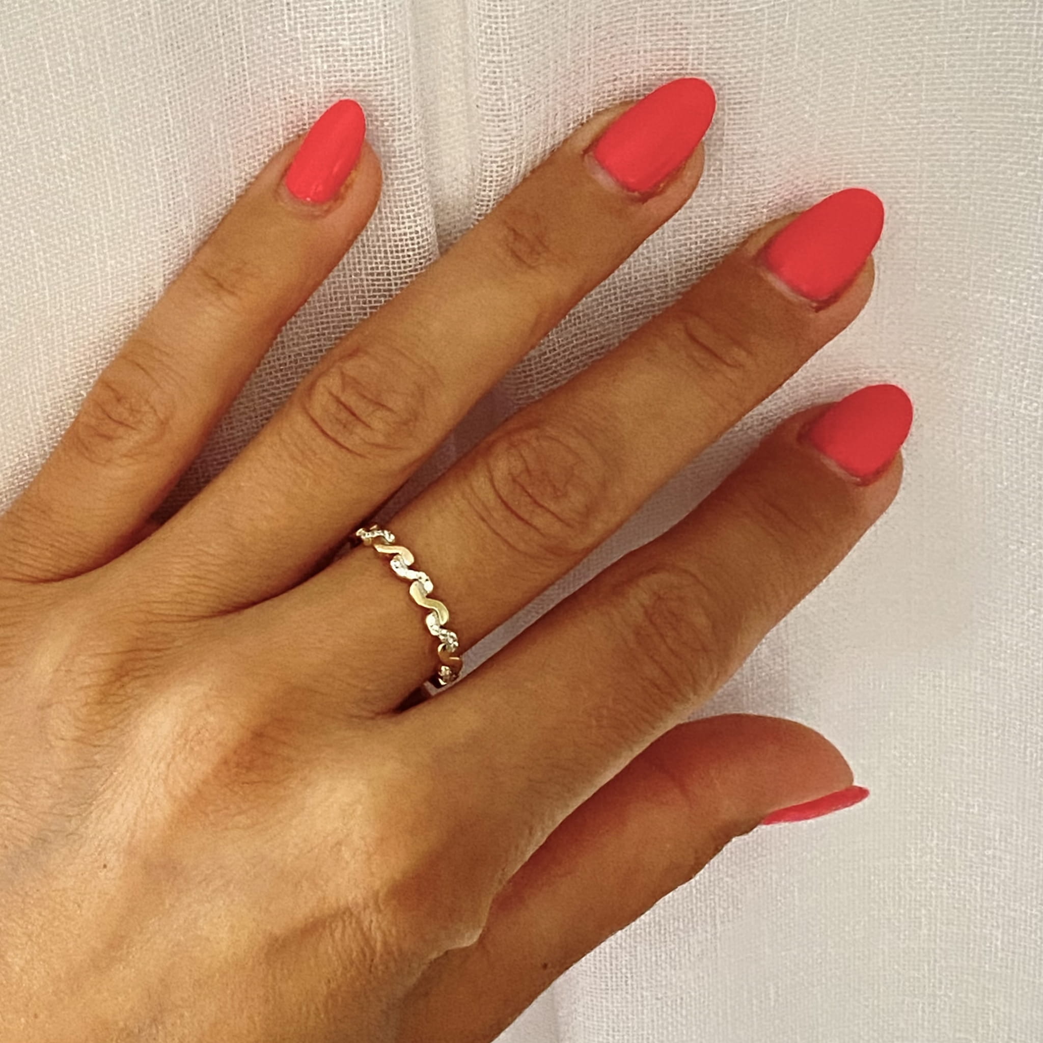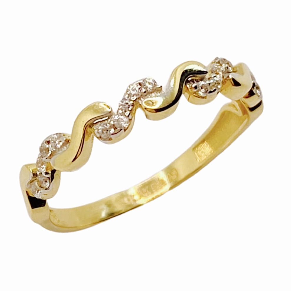 Złoty pierścionek ozdobiony białymi cyrkoniami wykonany jest z najlepszej jakości złota próby 585. Idealnie pasuje do codziennych stylizacji kobiety.