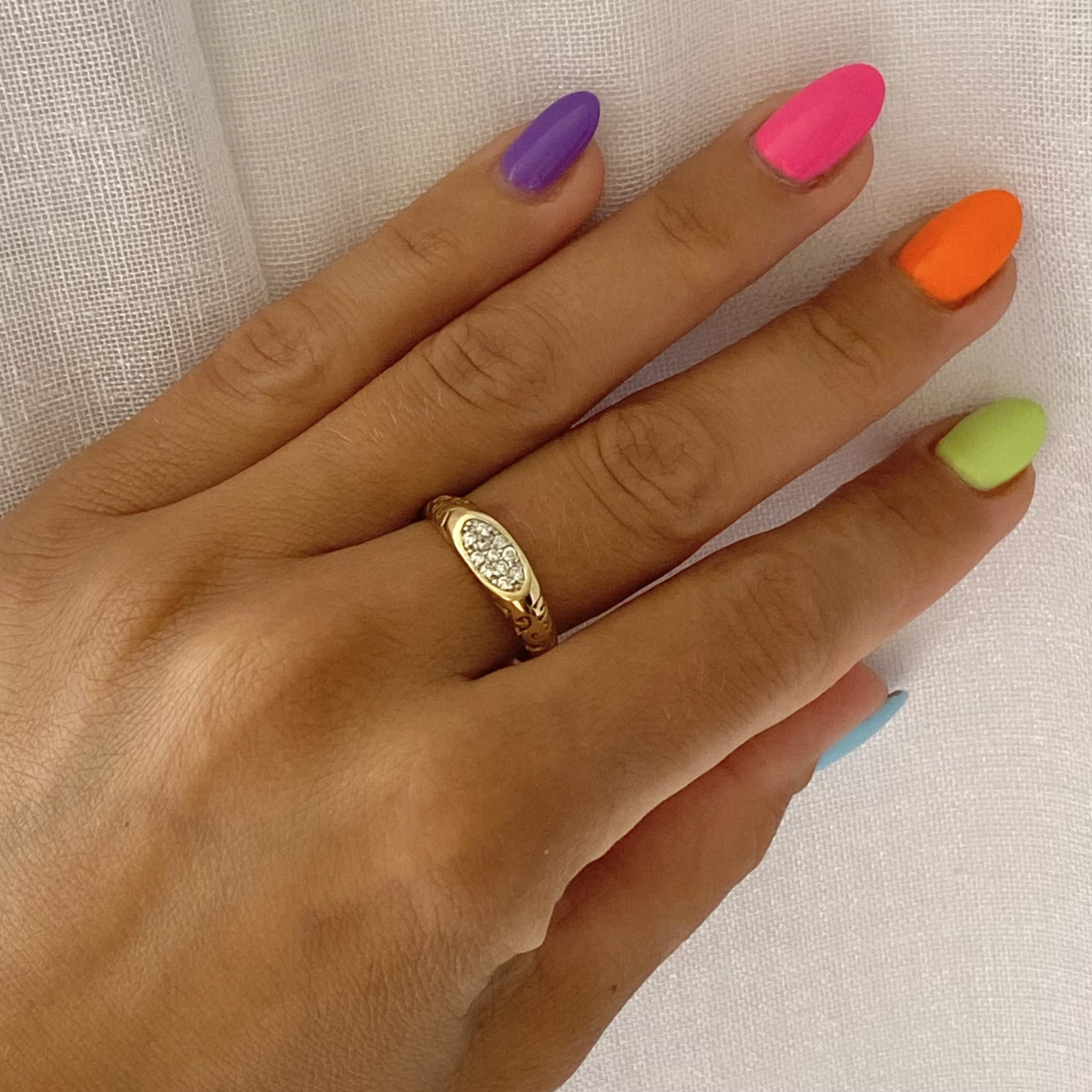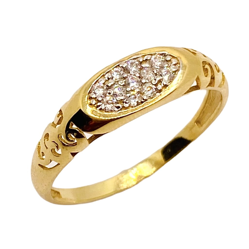 Złoty pierścionek delikatnie ażurowy, ozdobiony białymi cyrkoniami wykonany jest z najlepszej jakości złota próby 585. Idealnie pasuje do codziennych stylizacji kobiety.