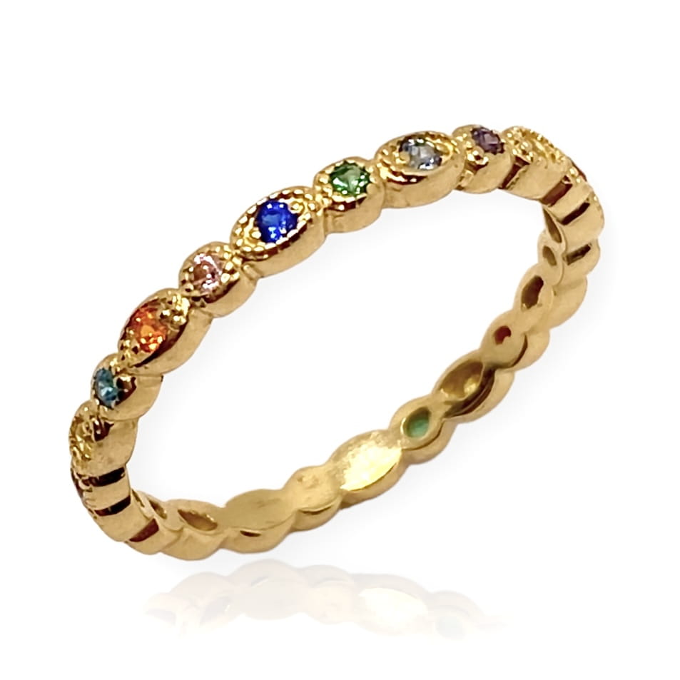 Piękny, delikatny złoty pierścionek ozdobiony kolorowymi cyrkoniami, wykonany jest z najlepszej jakości złota próby 585. Sprawdzi się idealnie jako prezent na każdą okazję. Pięknie prezentuje się w towarzystwie innej biżuterii.Wszystkie zakupione u nas produkty posiadają próbę i cechę nadaną przez Polski Urząd Probierczy, co stanowi 100% gwarancji o ich autentyczności. Do każdego zakupionego w naszym sklepie produktu, otrzymujesz jubilerskie pudełeczko GRATIS!