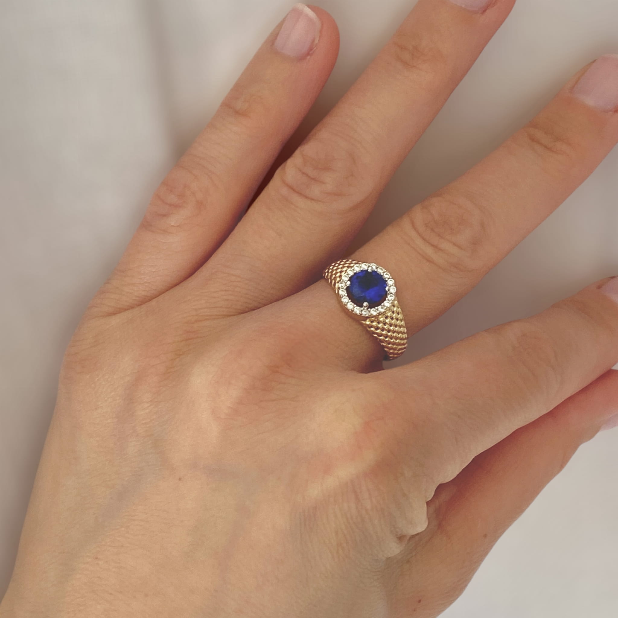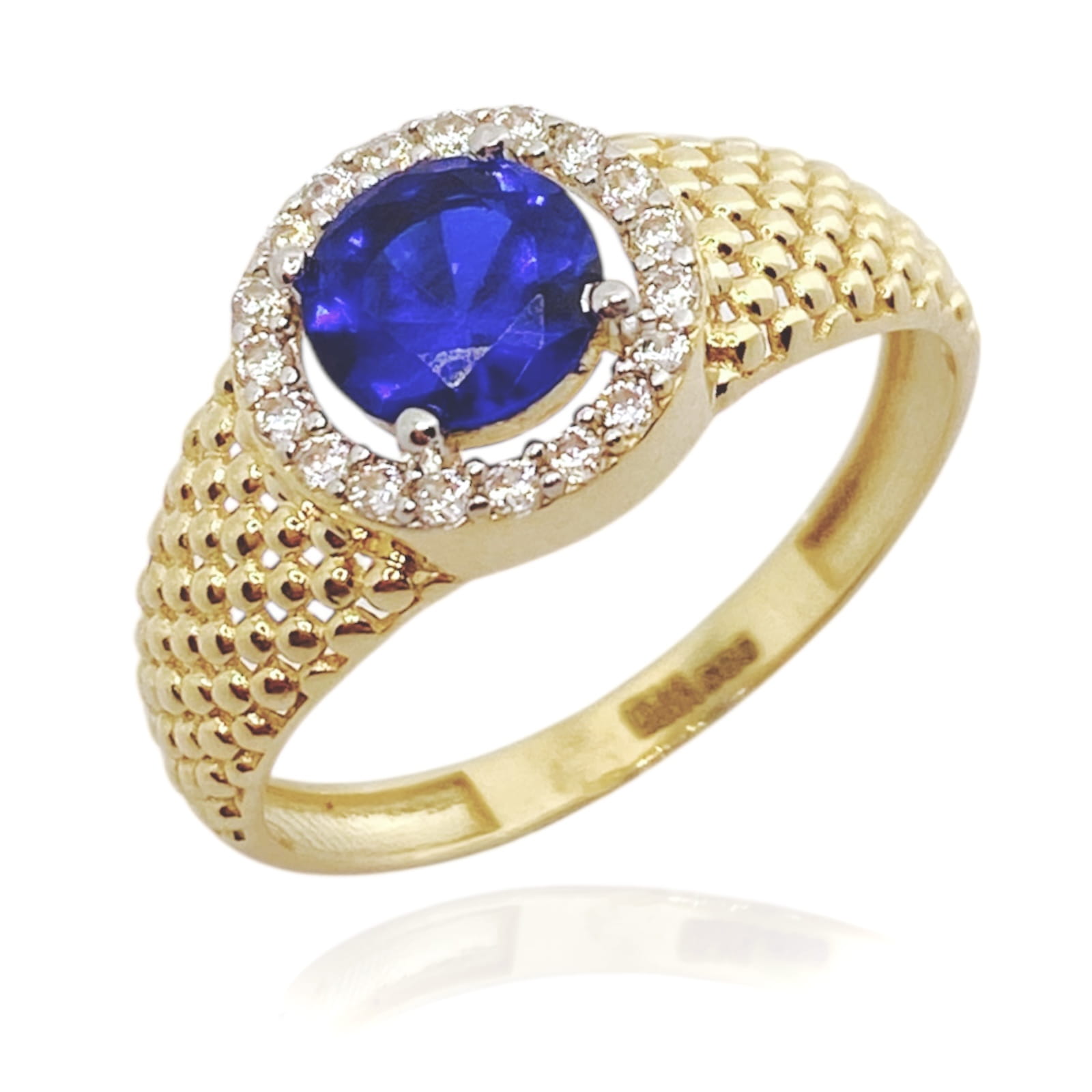 Elegancki pierścionek ozdobiony ozdobiony cyrkoniami wykonany został z najlepszej jakości złota próby 585. Bogaty wzór idealnie pasuje jako prezent na każdą okazję. Pięknie prezentuje się w towarzystwie innych pierścionków.