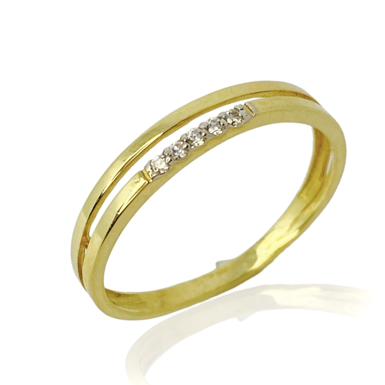 Złoty pierścionek ozdobiony białymi cyrkoniami, wykonany jest z najlepszej jakości złota próby 585. Delikatny, w kształcie obrączki, ponadczasowy, idealnie pasuje na prezent na każda okazję.