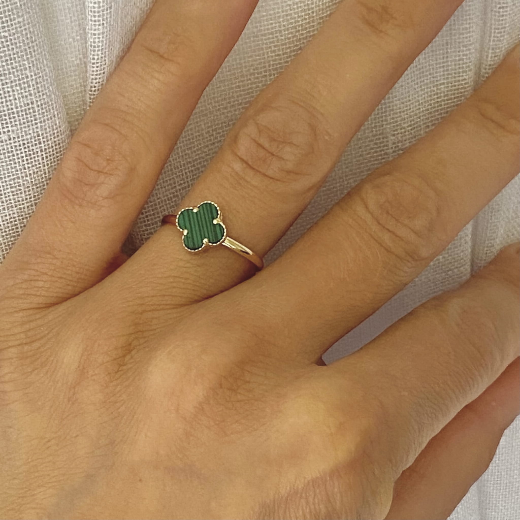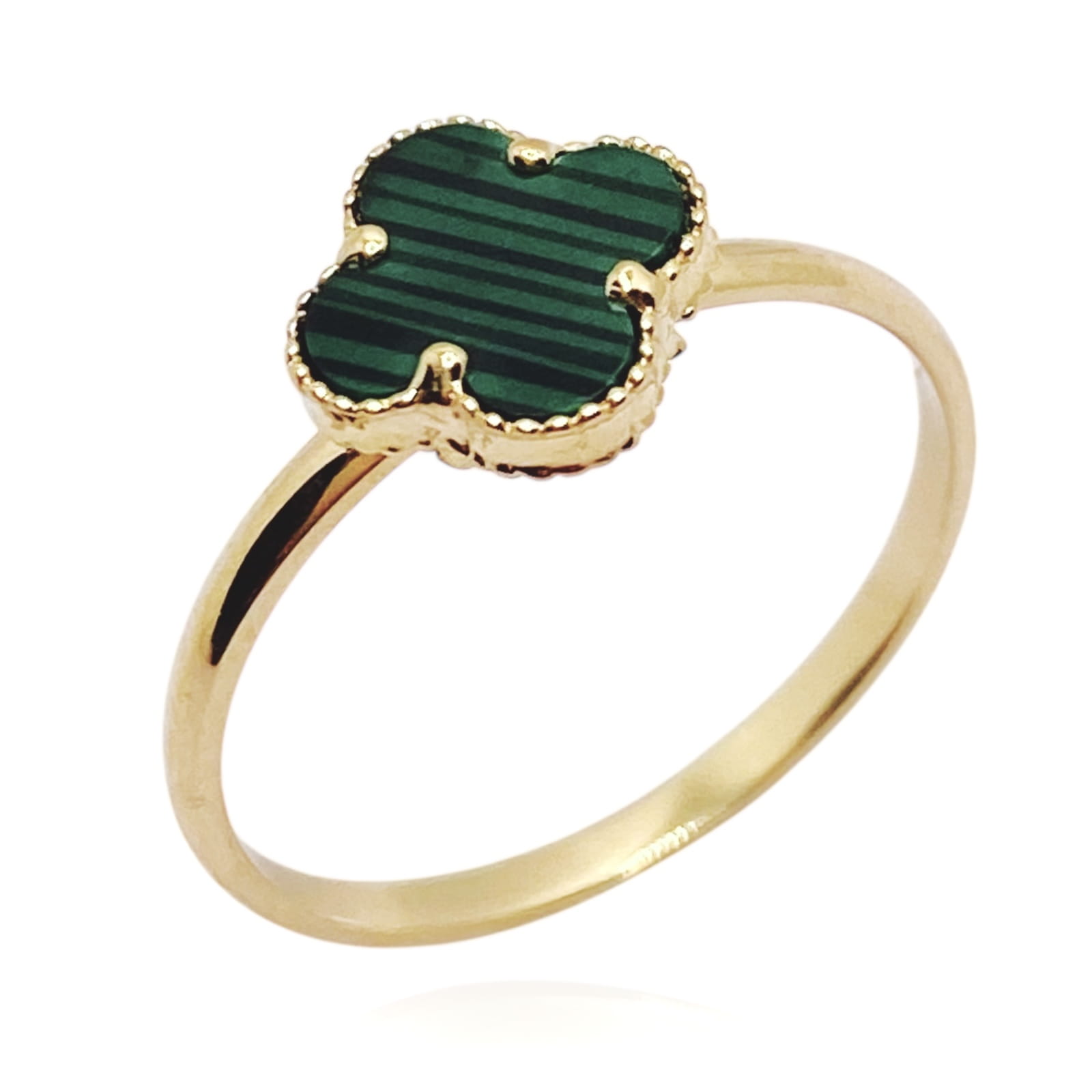 Złoty pierścionek ozdobiony malachitem, wykonany został z najlepszej jakości złota próby 585. Elegancki, klasyczny wzór idealnie pasuje jako prezent na każdą okazję.