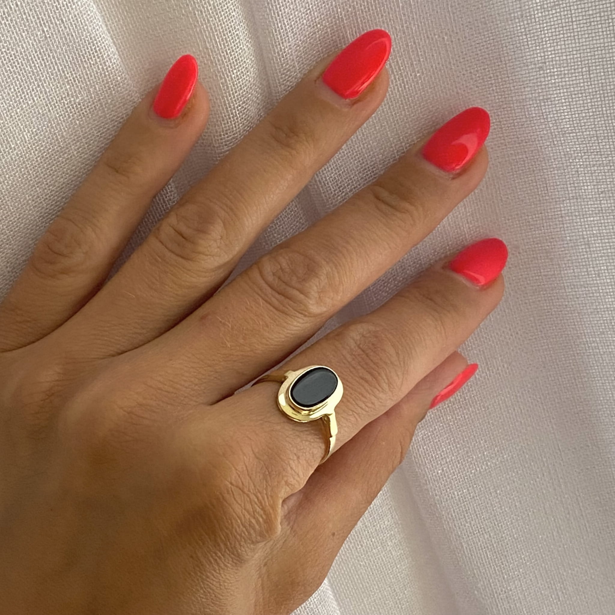 Złoty pierścionek ozdobiony onyksem wykonany jest z najlepszej jakości złota próby 585. Elegancki, klasyczny wzór idealnie pasuje jako prezent na każdą okazję. Do kompletu można nabyć zawieszkę i kolczyki.